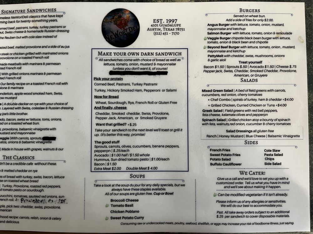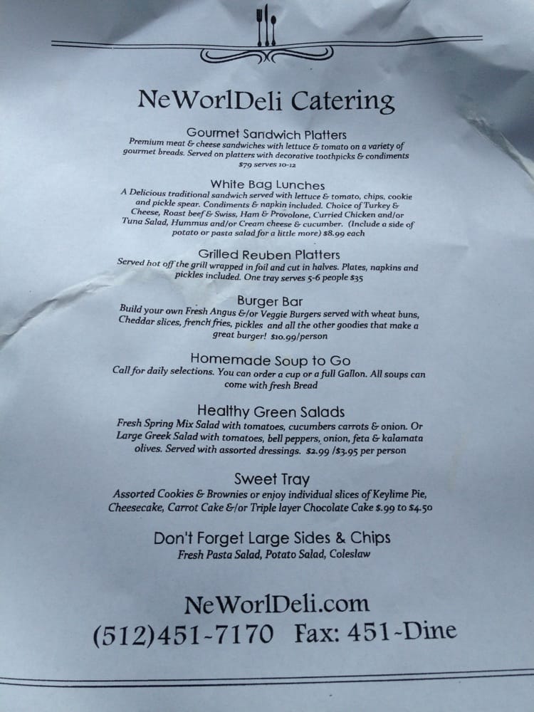 NeWorlDeli is a bustling deli and catering brand located in Austin, TX, offering a wide array of menu options. From delicious soups like Broccoli Cheese and Chicken Poblano, to refreshing salads like the Mixed Green and Greek Salad, there is something for everyone. The classics section features favorites like the Tuna Melt and Roasted Turkey Panini, providing comfort and satisfaction. The ambiance is casual with outdoor seating, making it a great spot for groups and families. The addition of vegan options, free Wi-Fi, and a full bar adds to the appeal of this establishment. With its convenient location and exceptional service, NeWorlDeli stands out as a must-visit destination for those seeking a tasty and satisfying meal experience.