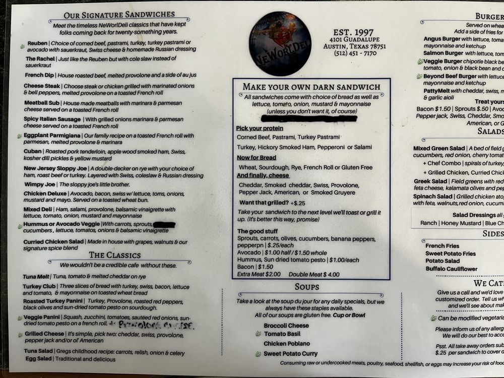 Choice of corned beef, pastrami, turkey, turkey pastrami or avocado with sauerkraut, Swiss cheese and homemade Russian dressing. Meet the timeless Newworldeli classics that have kept folks coming back for 20 something years.